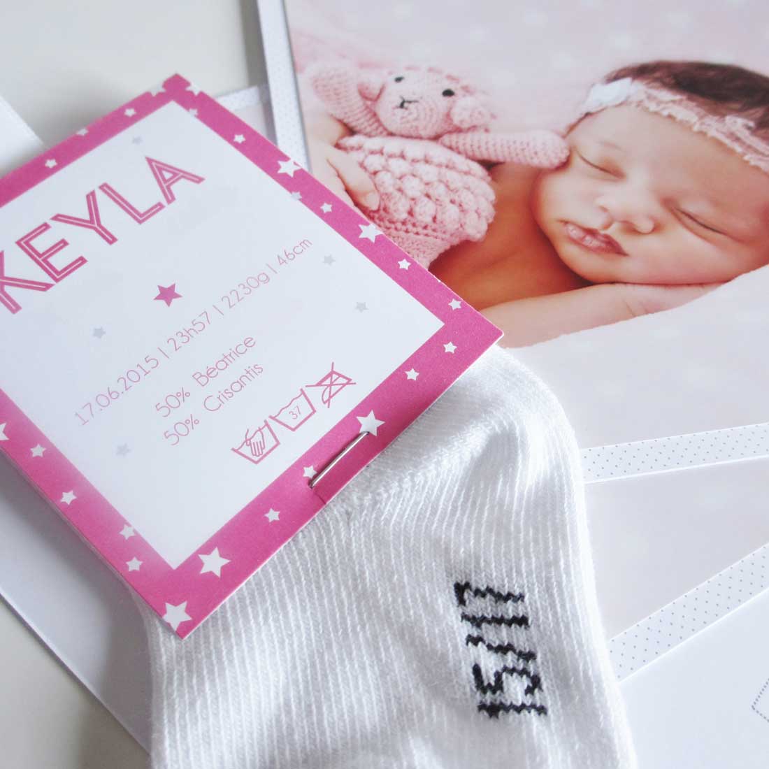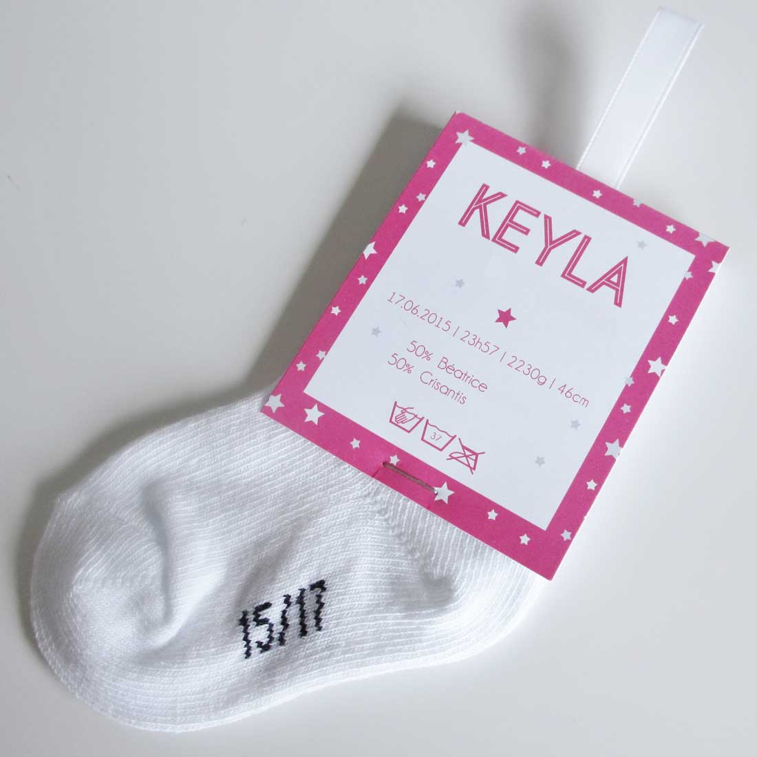FAIRE-PART COMPOSÉ D’UNE CHAUSSETTE ET D’UNE ÉTIQUETTE
